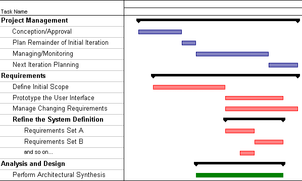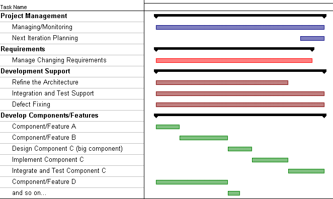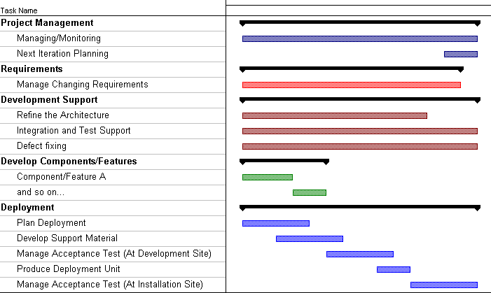 The graph shows how the emphasis varies over time. For example, in early iterations you spend more time on requirements; in later iterations you spend more time on implementation.
